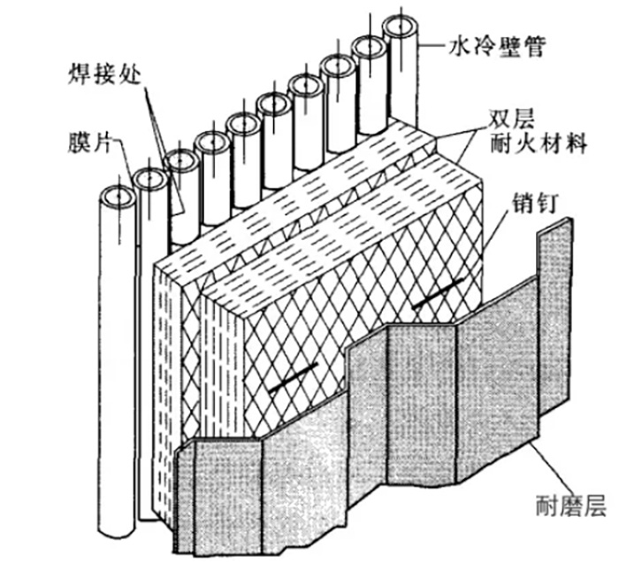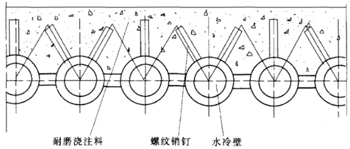如圖1所示,為循環(huán)流化床鍋爐燃燒室下部水冷壁管上耐磨澆注料的施工工藝,耐磨材料是由焊在管子表面上的金屬銷釘固定。由于該區(qū)域為燃燒室下部密相區(qū),其物料濃度很高,混合及湍流流動非常強烈,所以磨損非常嚴重。為了防磨,在下部密相區(qū)須襯有一定厚度的耐火、耐磨澆注料。
