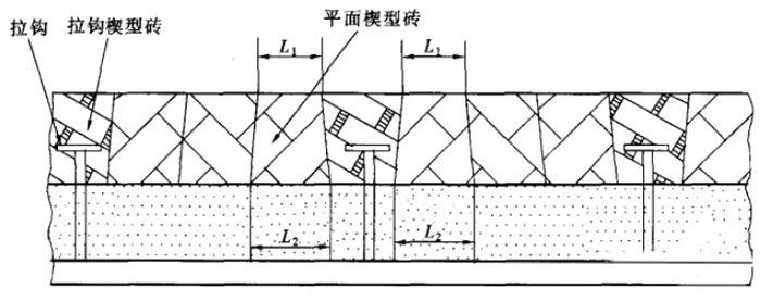 如圖8所示,為拉鉤楔形磚結(jié)構(gòu)形式,是利用楔形拉鉤磚的角度,使兩塊楔形拉鉤磚之間的平面楔形磚的L1均小于L2,使其脫出困難,可確保運行的。主要用在分離器的圓筒部分及錐段部分。