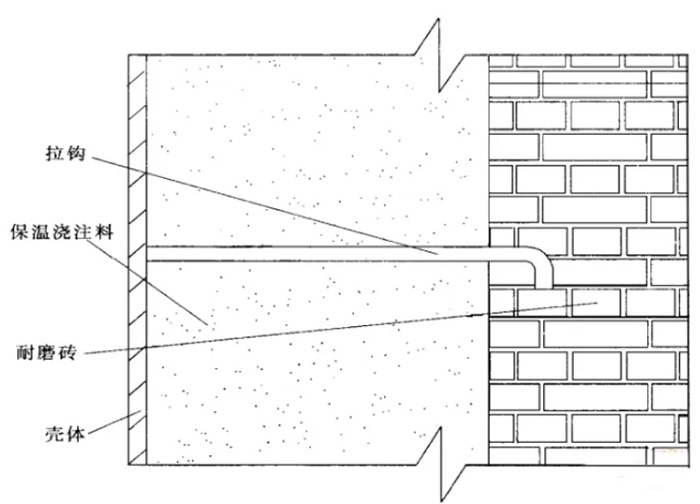 如圖5所示,為耐磨磚十保溫澆注料形式,同樣為解決膨脹每一定間隔留有膨脹縫,即耐磨磚與耐磨磚之間留有2mm的灰漿縫,耐磨磚上有用于拉鉤固定的凹槽,而且為了把耐磨磚的質(zhì)量分層傳遞到鋼殼上,并在適當高度設(shè)有高溫?zé)釓婁撝频耐屑?。這種形式適合于鋼殼形狀較復(fù)雜及其他不適合保溫磚的部位。