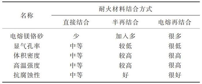 根據(jù)鎂鉻質(zhì)耐火材料的結(jié)合形式的不同,包括直接結(jié)合、半再結(jié)合、電熔再結(jié)合等鎂鉻質(zhì)耐火材料。其中,直接結(jié)合鎂鉻質(zhì)耐火材料是以高純燒結(jié)鎂砂和鉻鐵礦為原料,將電熔鎂砂與鉻礦直接燒結(jié);半再結(jié)合鎂鉻質(zhì)耐火材料是以電熔鎂鉻砂作屬粒,加入部分鉻礦和鎂砂或燒結(jié)合成鎂鉻料作細(xì)粉,高溫?zé)Y(jié)而成;電熔再結(jié)合鎂鉻質(zhì)耐火材料是將鉻礦與電熔鎂砂在電爐中電熔,制得電熔鎂鉻砂,再高溫?zé)Y(jié)而成。3類鎂鉻質(zhì)耐火磚材料特性對比,見表1。
