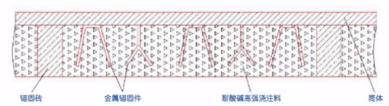 采用上述澆注料在回轉(zhuǎn)窯筒體的內(nèi)表面上澆注厚度不低于250mm。內(nèi)襯包括多塊呈軸向均勻分布固定于筒體內(nèi)表面的酸性或中性錨固磚,錨固磚兩側(cè)的筒體內(nèi)表面固定有多個均勻分布的金屬錨固件,再用耐酸堿高溫澆注料,該耐酸高強澆注料通過錨固磚和金屬錨固件與筒體連接為一體。局部內(nèi)襯結(jié)構(gòu)如圖1所示。