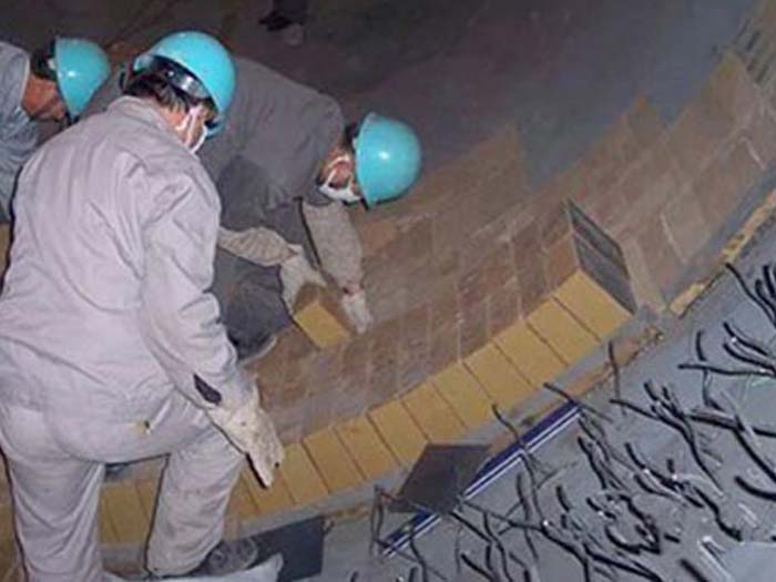 受到的是壓、拉、扭、剪的綜合機(jī)械應(yīng)力。窯的轉(zhuǎn)動(dòng),筒體橢圓度,襯磚和筒體之間及磚與磚之間的擠壓、扭動(dòng)、窯筒體變形,都會(huì)在磚襯之間產(chǎn)生機(jī)械應(yīng)力。當(dāng)筒體與輪帶間隙較大,使窯筒體橢圓度增大,襯磚受交變應(yīng)力增加,輪帶部位所受的機(jī)械應(yīng)力更為嚴(yán)重。我廠在更新磚后曾發(fā)生窯筒體彎曲,劇烈振動(dòng)加上窯襯時(shí)有局部過(guò)熱,引起胴體變形擠壓內(nèi)襯,再之托輪調(diào)整費(fèi)時(shí)較長(zhǎng),在距窯前6m整三號(hào)輪帶處發(fā)生紅窯,耐火磚在一個(gè)部位大面積脫落,挖補(bǔ),托輪調(diào)整正常窯體不再振動(dòng),此次之后再未發(fā)生紅窯現(xiàn)象。